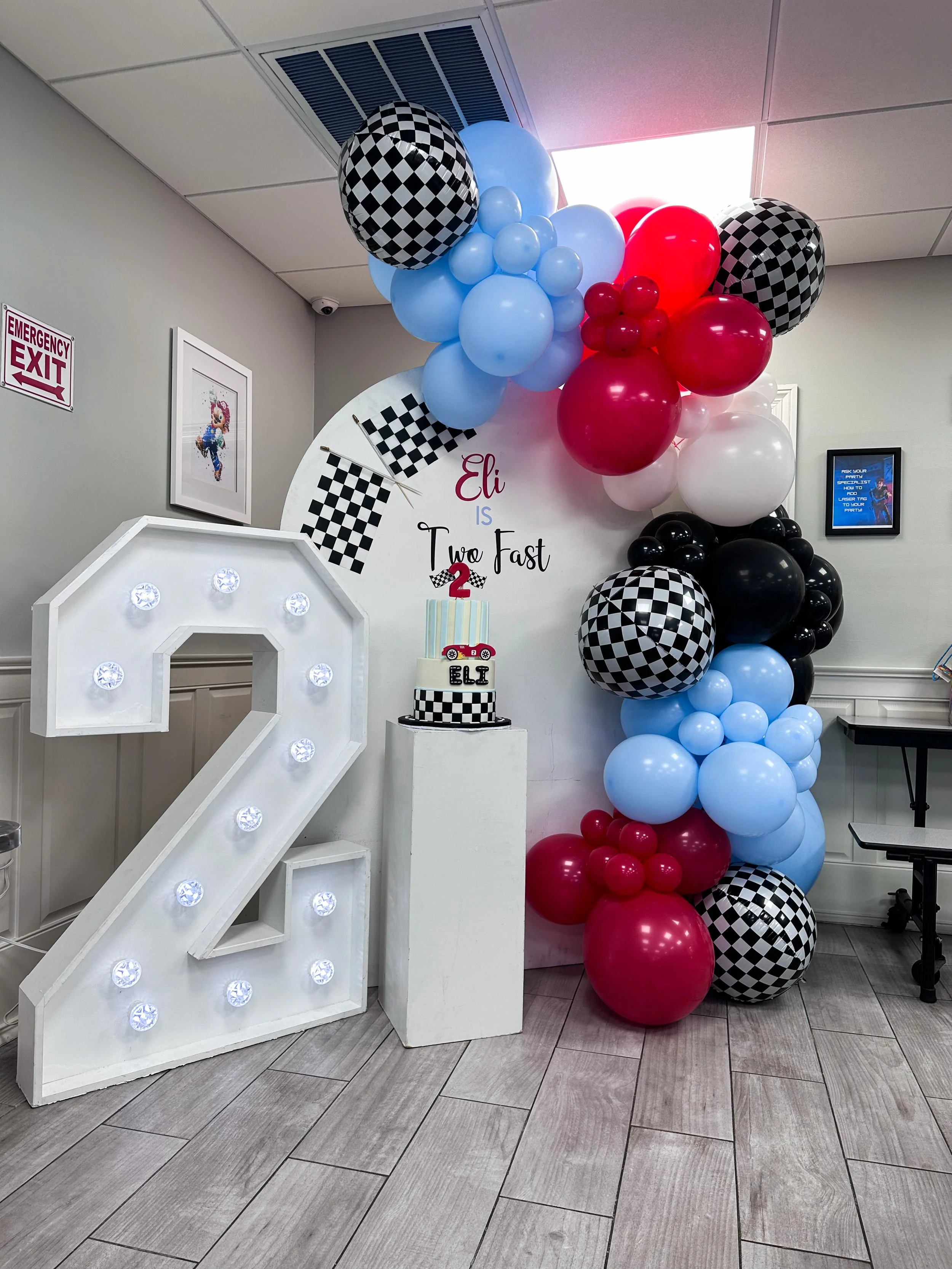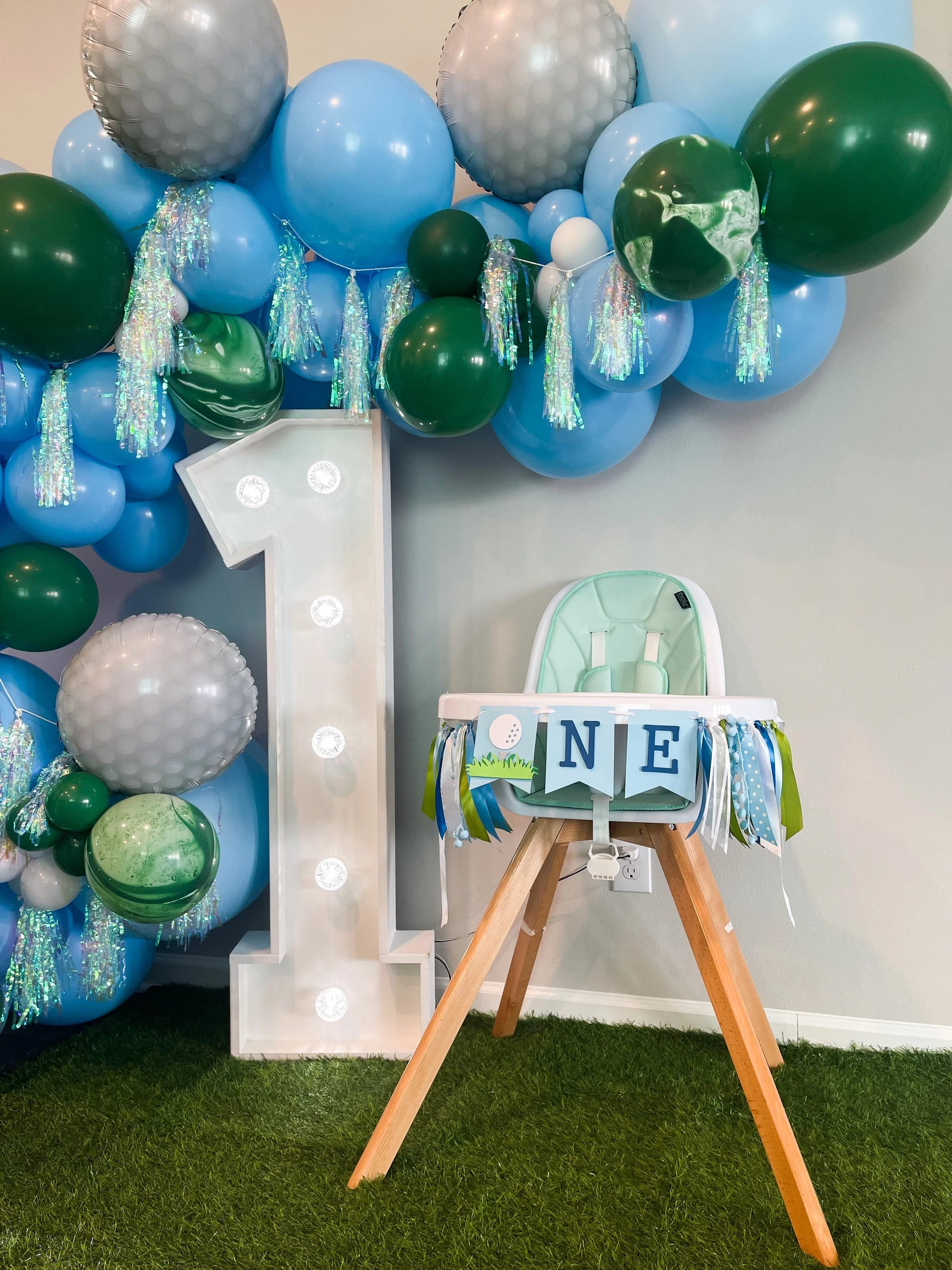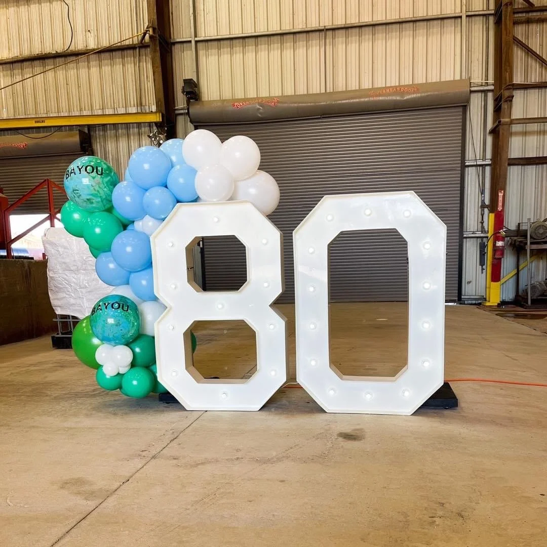 Incorporating marquee numbers adds personality! Marquees make for fun photo backdrops and can be surrounded by other fun party decorations, including balloon arches.